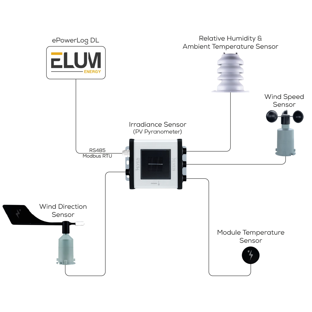 SEVEN provides a full set of Weather Station for Solar PV Plants, compatible with Elum Datalogger (ePowerLog DL). Elum ePowerLog DL is a universal data recording and monitoring device for solar power plants, telecommunication sites and industrial buildings. The ePowerLog DL enables simple and reliable monitoring by recording all data from SEVEN Weather Stations and communicating them to ePowerMonitor platform.