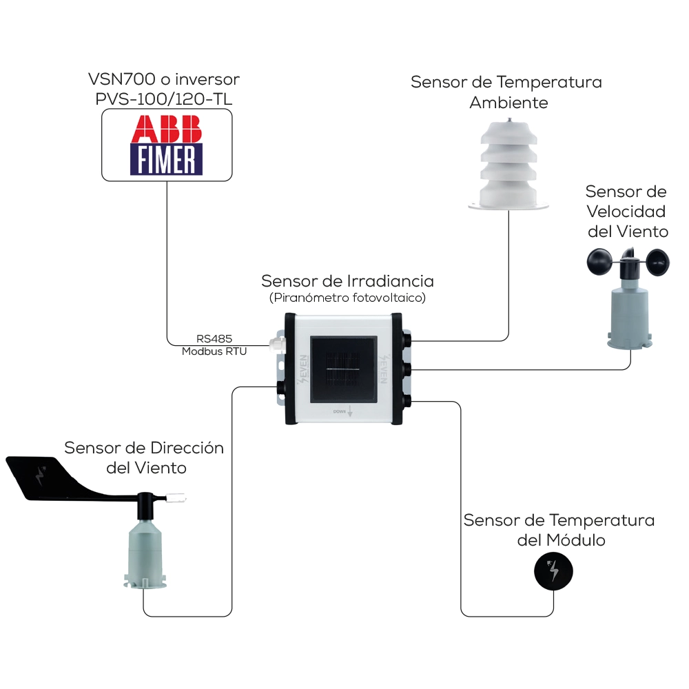 SEVEN proporciona un conjunto completo de estaciones meteorológicas compatibles con el inversor ABB/Fimer y el registrador de datos VSN700. Contiene los sensores necesarios para monitorear plantas solares fotovoltaicas.