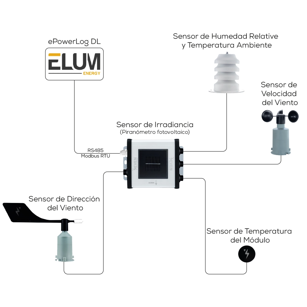 SEVEN proporciona un conjunto completo de Estación Meteorológica para Plantas Solares FV, compatible con Elum Datalogger (ePowerLog DL). Elum ePowerLog DL es un dispositivo universal de registro y monitorización de datos para plantas de energía solar, emplazamientos de telecomunicaciones y edificios industriales.