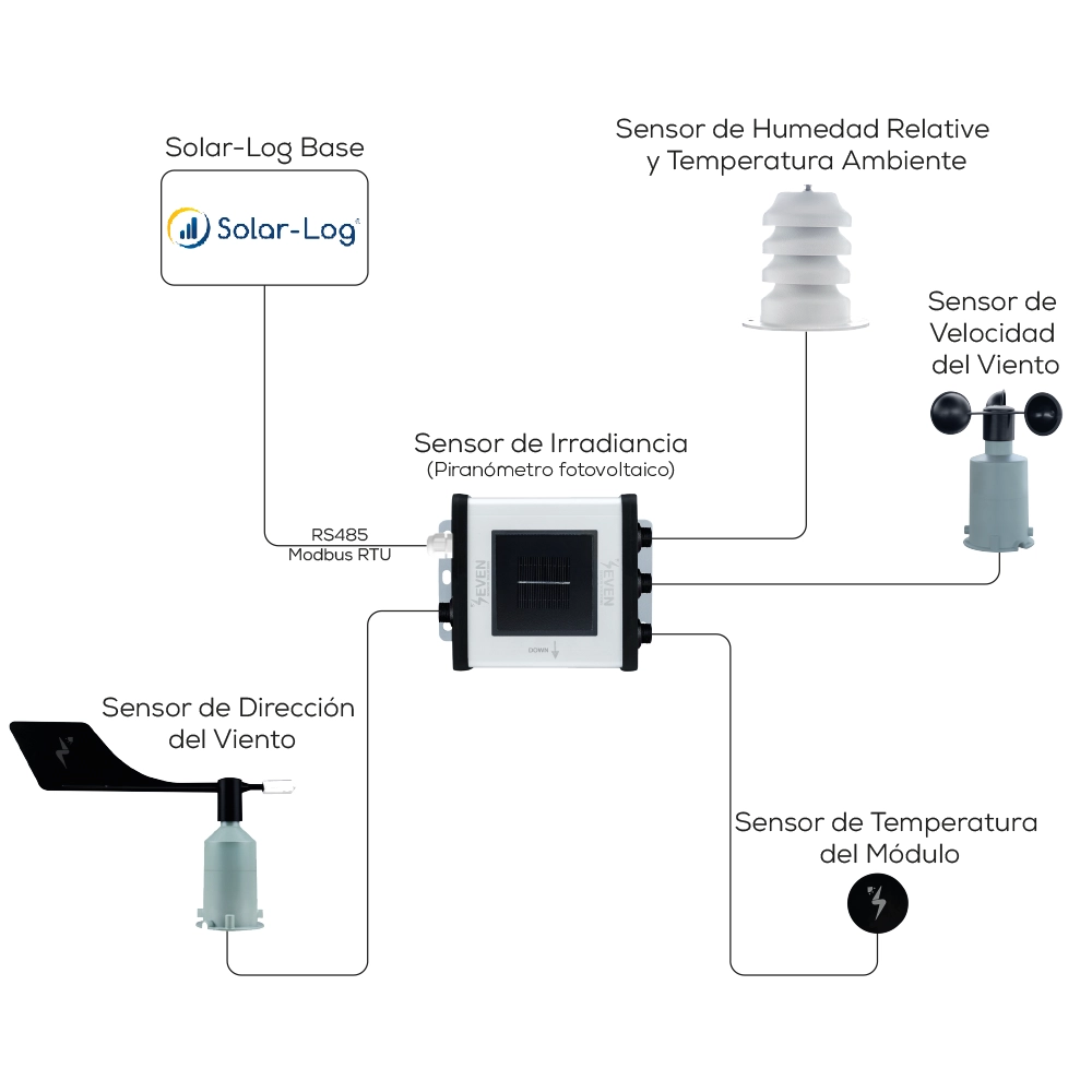 SEVEN ofrece una solución completa de estación meteorológica para plantas solares, totalmente compatible con los registradores de datos y sistemas de monitoreo Solar-Log™. Incluye todos los sensores esenciales necesarios para un monitoreo efectivo de la planta, como irradiancia, temperatura trasera del módulo, humedad relativa, temperatura ambiente, velocidad y dirección del viento.