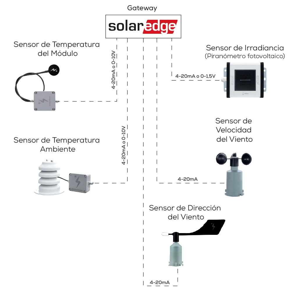 SEVEN proporciona un conjunto completo de estaciones meteorológicas para plantas de energía solar compatibles con los registradores de datos SolarEdge. Incluye diferentes sensores necesarios para monitorear la planta solar fotovoltaica utilizando el Portal de monitorización de SolarEdge. Estos sensores son completamente compatibles con la puerta de enlace (Gateway) de SolarEdge, que tiene tres puertos de conexión que permiten la conexión de tres sensores analógicos.