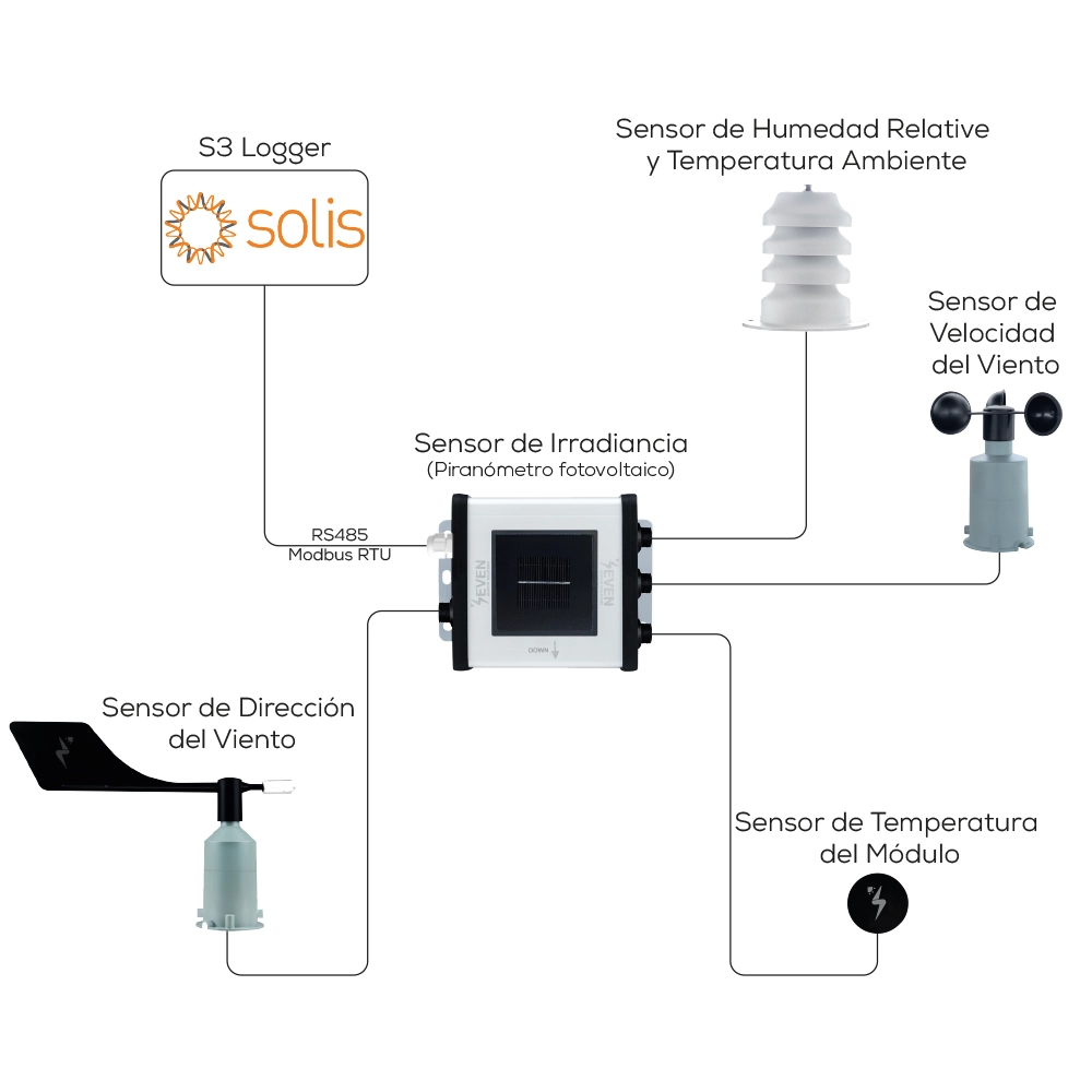 SEVEN proporciona un conjunto completo de Estación Meteorológica para Plantas Solares FV, compatible con el Registrador de Datos (datalogger) de Solis.