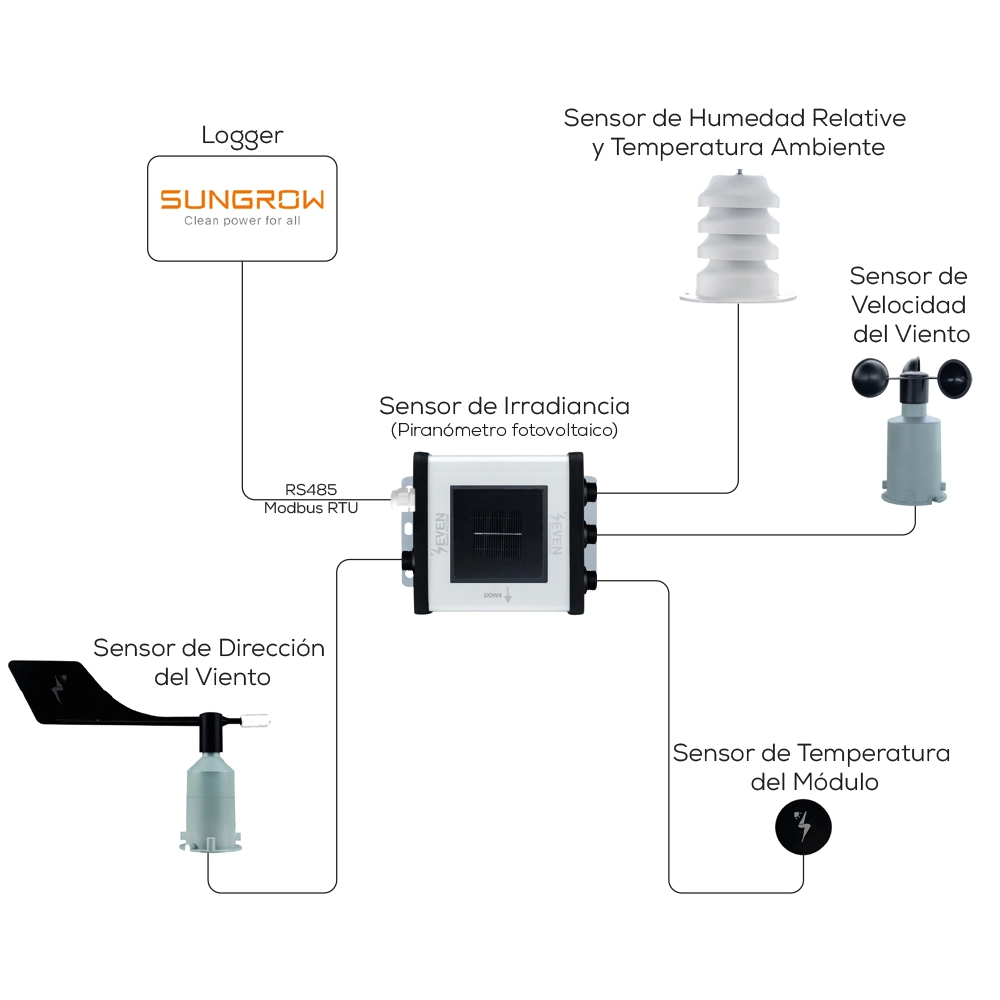 - Sensor de Irradiación o Piranómetro PV, con salida Modbus RTU, que mide la radiación, también se utiliza como Celda de Referencia debido a su alta precisión de medición. Teniendo en cuenta que el uso de este piranómetro fotovoltaico es crucial para la medición en aplicaciones solares, el Sensor de Irradiación de SEVEN está diseñado como una caja de sensores, ya que contiene un sensor interno de temperatura de la célula. También tiene hasta cinco puertos de entrada para sensores adicionales y un puerto de salida conectado al Logger de Sungrow a través de un cable RS485.