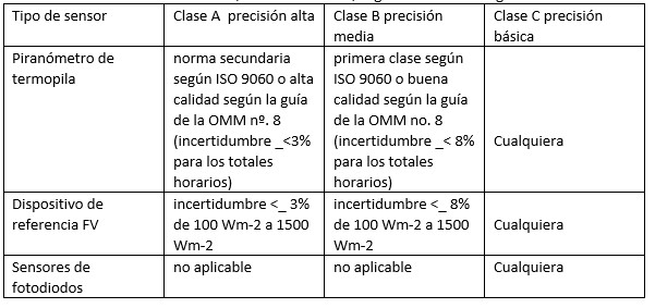 Los piranómetros no son todos de la misma calidad. La Organización Meteorológica Mundial (OMM) y la Organización Internacional de Normalización (ISO) han establecido tres categorías de piranómetros para diferentes aplicaciones.