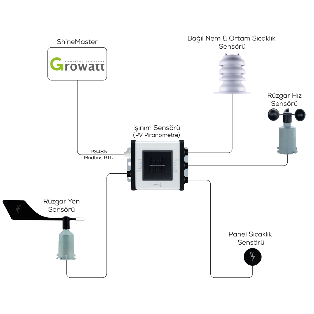 SEVEN Sensör, Growatt veri kaydediciler ile uyumlu hava gözlem istasyonu sensörlerinin üretimini sağlamaktadır. Sensörler verilerini Modbus protokolü ile veri kaydediciye aktarmaktadır ve sensör verileri Growatt izleme sistemi ShineMaster üzerinden takip edilmektedir.