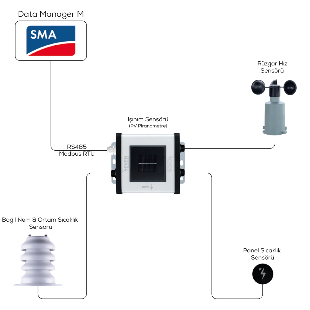 Güneş Enerji Santrallerinin üretiminin takip edilmesi için inverterler ve veri kaydediciler yeterlidir ancak santralin performans takibi için yeterli değildir. Sahanızın enerji üretimi ile günlük-aylık olarak hava şartları ile üretebileceği enerjinin kıyaslanması gerekmektedir. Bu kıyaslama için meteorolojik verilerin ölçümünü yapan sensörlere ihtiyaç duyulmaktadır. SEVEN sensör üretimini yaptığı hava istasyonları ile sizlere ışınım, panel sıcaklığı, ortam sıcaklığı, rüzgâr hızı, rüzgâr yönü, bağıl nem, yağış yükü gibi meteorolojik verilerin ölçümünü sağlamaktadır. Bu sensörler SMA Data Manager M ve Cluster Controllers ile entegre edilebilmektedir ve sizlere izleme sistemi üzerinden bir Performans oranı(PR-Performance Ratio) sunmaktadır.