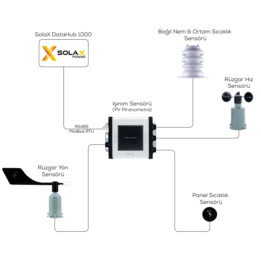 SEVEN, SolaX DataHub 1000 ile uyumlu meteoroloji istasyonu üretmektedir. DataHub1000, birden fazla SolaX inverterini ve Işınım Sensörü, Panel ve Ortam Sıcaklık Sensörleri, Rüzgar Hız ve Yön Sensörleri, ve Bağıl Nem Sensörü gibi çeşitli sensörleri izleyebilen bir cihazdır.