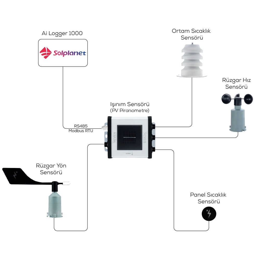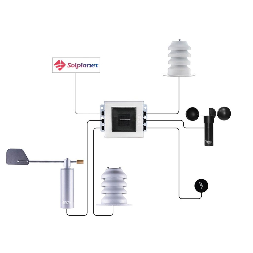 SEVEN, PV Tesisleri için Solplanet Ai-Logger 1000 Datalogger ile uyumlu hava istasyonu seti sağlamaktadır. Ai-Logger 1000, aynı anda 80 farklı cihazı (P inverterler, hibrit inverterler, akıllı sayaçlar ve meteoroloji istasyonları dahil) yönetebilen bir veri kaydedicidir. Ai-Logger 1000, kurulan tesisin uzaktan performansının izlenmesi için Solplanet Cloud'a bağlanmayı sağlayan yerleşik bir web sayfasına sahiptir. SEVEN hava istasyonunu RS485 portuna bağlayarak Işınım, Panel ve Ortam Sıcaklıkları, Rüzgar Hızı ve Yönü ve Bağıl Nemin izlenmesini sağlar. Böylece son kullanıcı tesisin performansını kontrol edebilir.